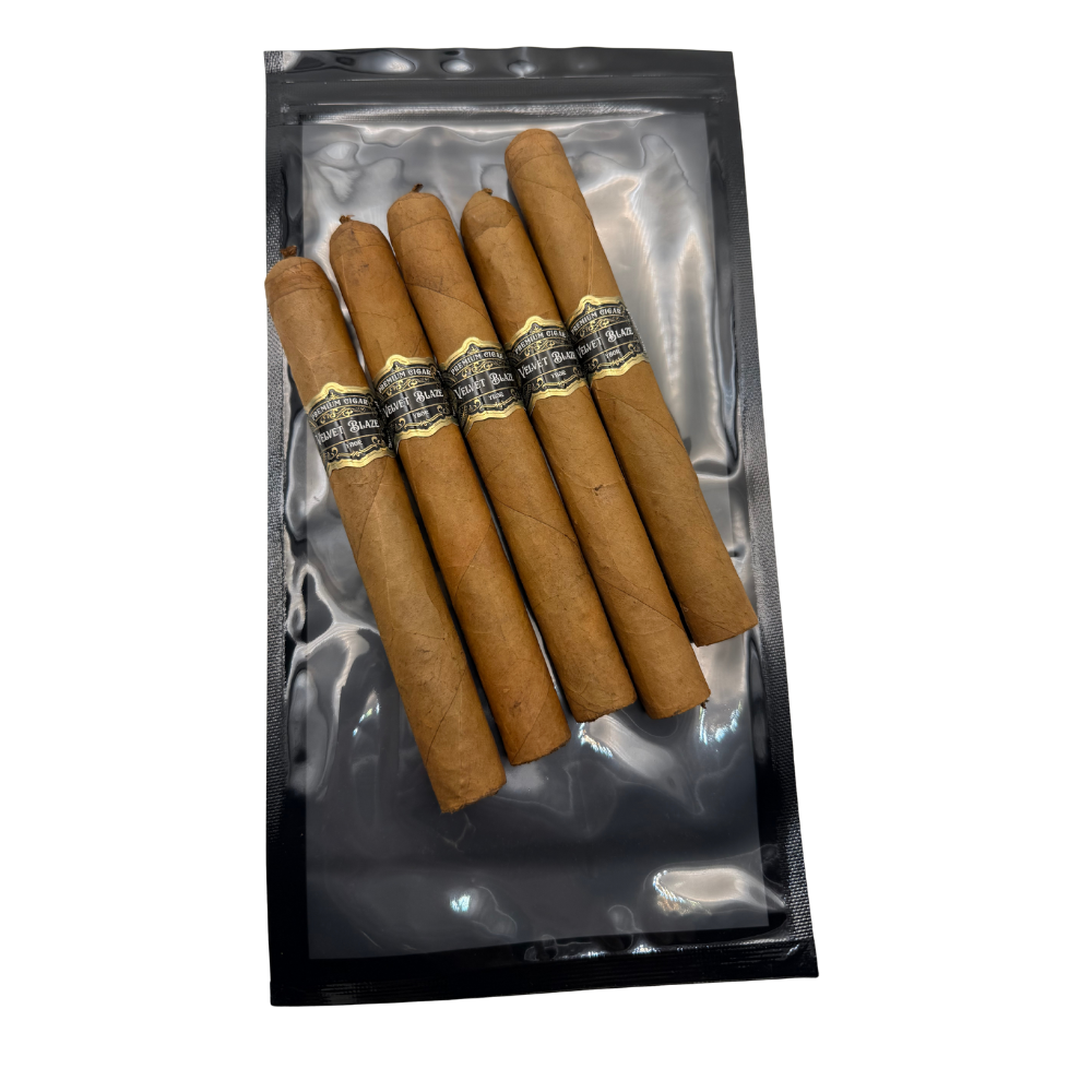 Created for the woman who knows cigars are part ritual and part reward, the Velvet Blaze Signature Six Pack offers five beautifully crafted Robustos wrapped in a golden Connecticut Shade leaf. Each cigar delivers a silky, creamy start with whispers of cedar, toasted almond, and vanilla cream. As the burn deepens, soft honey and white pepper rise gently, creating a balanced, velvety finish. Ideal for personal enjoyment, girls’ night gatherings, or gifting someone who loves quiet luxury.